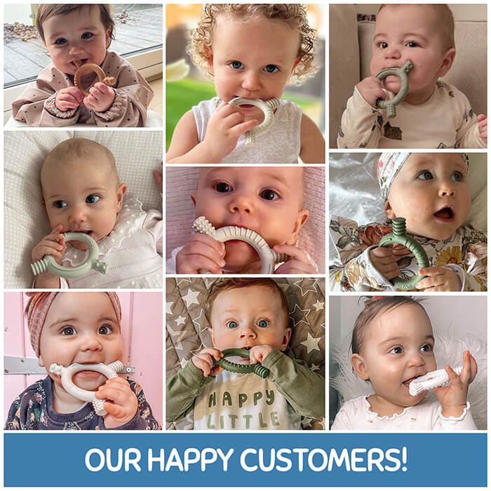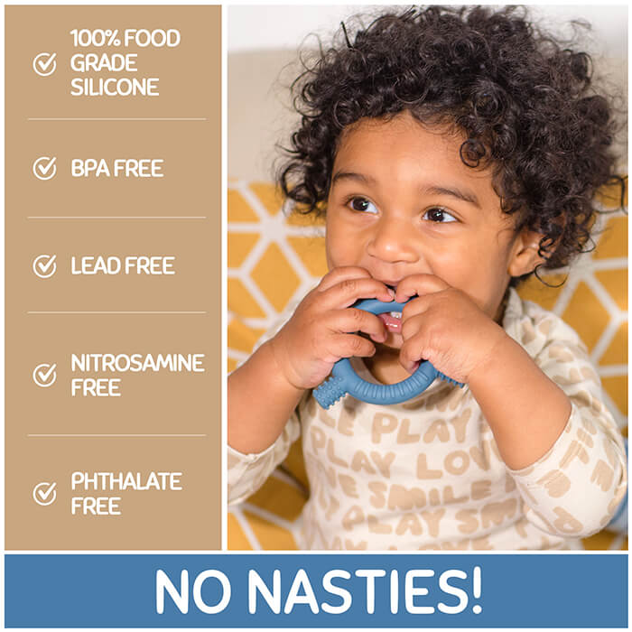 100% food-grade, durable soft touch silicone teether. Made in with one solid piece with no hard edges or parts to break off. No nasty chemical smells, no leaky gels or liquids, no risk of suffocation. Just safe fun for your baby to chew on. - DON’T FRET