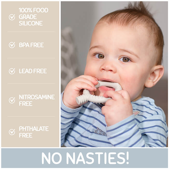 100% food-grade, durable soft touch silicone teether. Made in with one solid piece with no hard edges or parts to break off. No nasty chemical smells, no leaky gels or liquids, no risk of suffocation. Just safe fun for your baby to chew on. - DON’T FRET