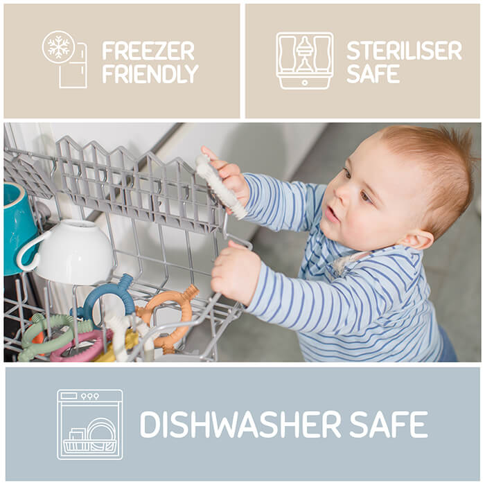 It’s easy peasy to clean all that sloppy drool off with warm soapy water. This teether is both dishwasher safe and steriliser safe. It’s also freezer friendly for when you need that extra bit of soothing cold relief. Ice ice baby. - SILKY SOFT